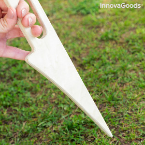 O masă de vin pliabilă, portabilă, pentru exterior, ideală pentru a vă bucura de un timp de relaxare în cea mai bună companie alături de un vin bun. Soluția ideală pentru a nu fi nevoit să lăsați vinul, paharele sau gustările pe podea, prevenind astfel apariția insectelor, vărsările, murdăria etc. Această masă originală din placaj de tei este robustă, ușoară, ușor și convenabil de pliat și desfăcut, pentru utilizare sau pentru economisirea spațiului pentru a facilita transportul și depozitarea. Poate fi transportată și instalată cu ușurință pe plajă, în mediul rural, la munte, grădină etc. Tot ce trebuie să faceți este să-i introduceți singurul picior în formă de vârf în pământ (pământ sau nisip) și astfel se asigură o prindere fermă. Este ușor de introdus și de scos. Zona sa plată de sprijin are un orificiu în care să așezi o sticlă de vin și două orificii pentru a plasa două pahare de vin, lăsând totuși spațiu pentru un castron mic de gustări sau aperitive. Are, de asemenea, încă două orificii (unul pe suprafață și altul pe picior) care pot fi folosite pentru a-l prinde și mânui (unul dintre ele este și mânerul de transport). Este rapid și ușor de curățat.